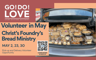 Each Saturday, Christ's Foundry distributes bread and bakery goods to neighbors in need. UPUMC regularly partners with Christ's Foundry to provide volunteers who will go to their two partner stores, pick up the bread and bakery goods at 9 AM (stores will have them ready), and deliver them to Christ's Foundry by 10 AM for distribution. To volunteer for one or more Saturdays, you can sign up here!