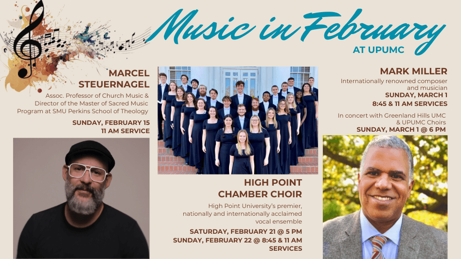 Make plans to join us for a rich season of music and worship at UPUMC this winter. We are excited to welcome Marcel Steuernagel, Associate Professor of Church Music and Director of the Master of Sacred Music Program at SMU Perkins School of Theology, who will join us during worship on Sunday, February 15, bringing his musical gifts and leadership to our services.