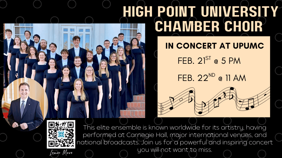 The celebration continues with the High Point University Chamber Singers, who will present a special concert at UPUMC on Saturday, February 21, at 5:00 pm, and then share their music during worship on Sunday, February 22, at both the 8:45 and 11:00 am services. Their nationally and internationally acclaimed choral artistry promises a meaningful and inspiring experience.
